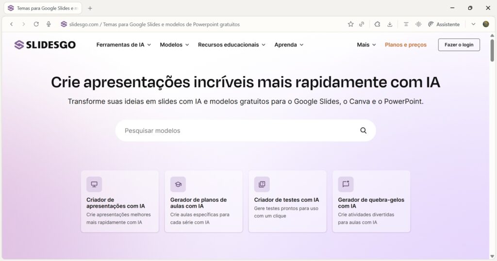 Ferramenta de design com inteligência artificial para a criação de apresentações, planos de aulas e testes de aulas com diversos modelos.