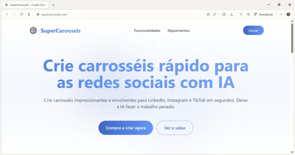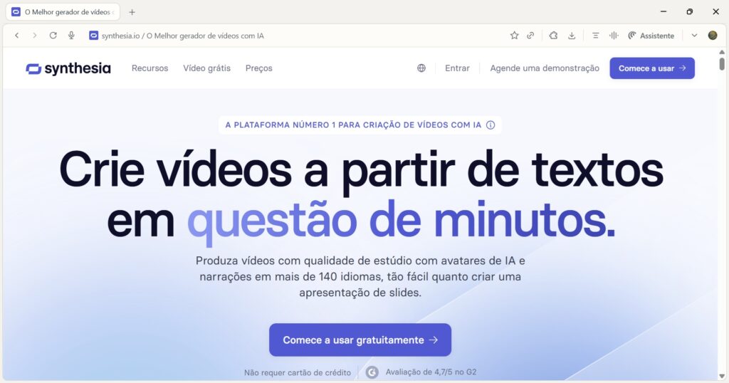 Ferramenta para criação de vídeos a partir de textos com opções de modelos e locução com avatares criados por inteligência artificial.